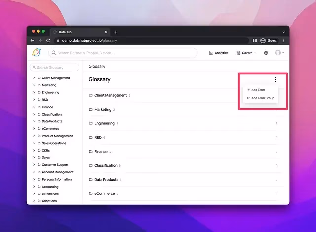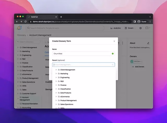 DataHub’s Business Glossary ensures that data elements are logically classified in the business context so teams understand how different terms relate to one another.