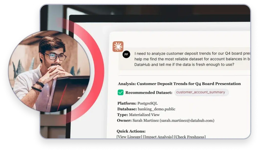 Break down data silos with conversational data discovery. The Ask DataHub chat agent finds trusted data through natural language questions.