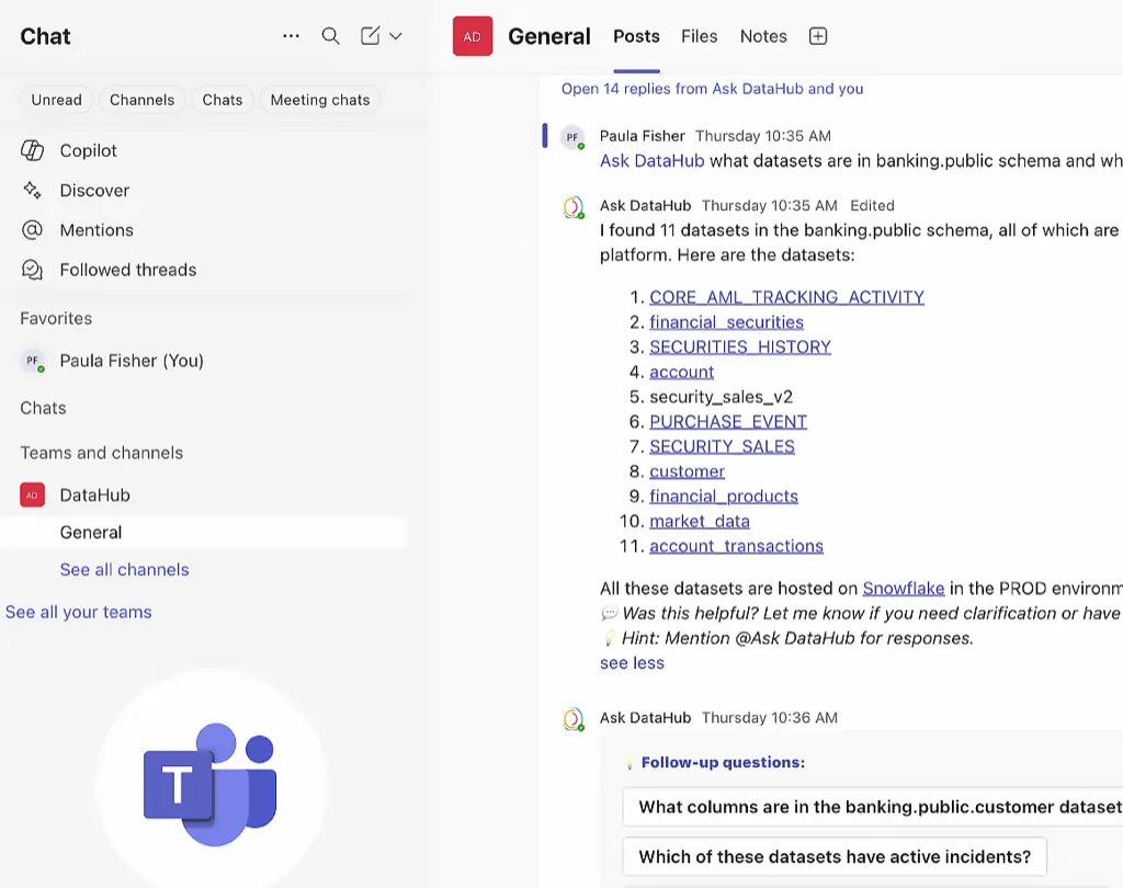 The Ask DataHub chat agent delivers immediate answers to natural language questions about your data—right in DataHub, Slack, or Teams. Business users self-serve insights instead of waiting for engineers to trace problems manually.