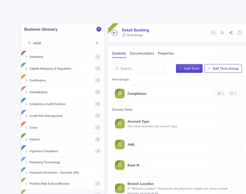 Define business terms in a central glossary for consistent tracking and reporting. Create custom fields and set required properties to enforce your unique governance requirements.