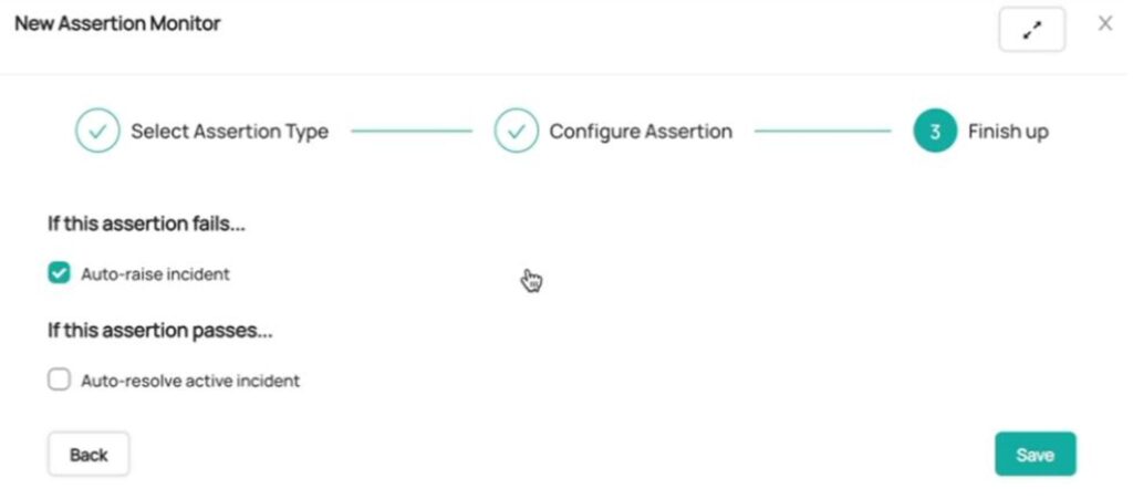 Once you set the parameters for monitoring, you can decide how you want the assertion to automatically trigger an incident when it fails. This allows you to broadcast a health issue to all relevant stakeholders.