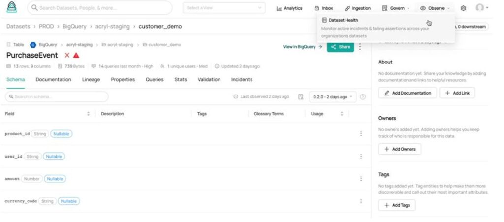 DataHub goes beyond observability – it is the central source of truth for the health of your data – encompassing both technical health, e.g. day to day-to-day data quality as well as governance health or compliance health like documented purpose, classification, accountability via ownership, etc.