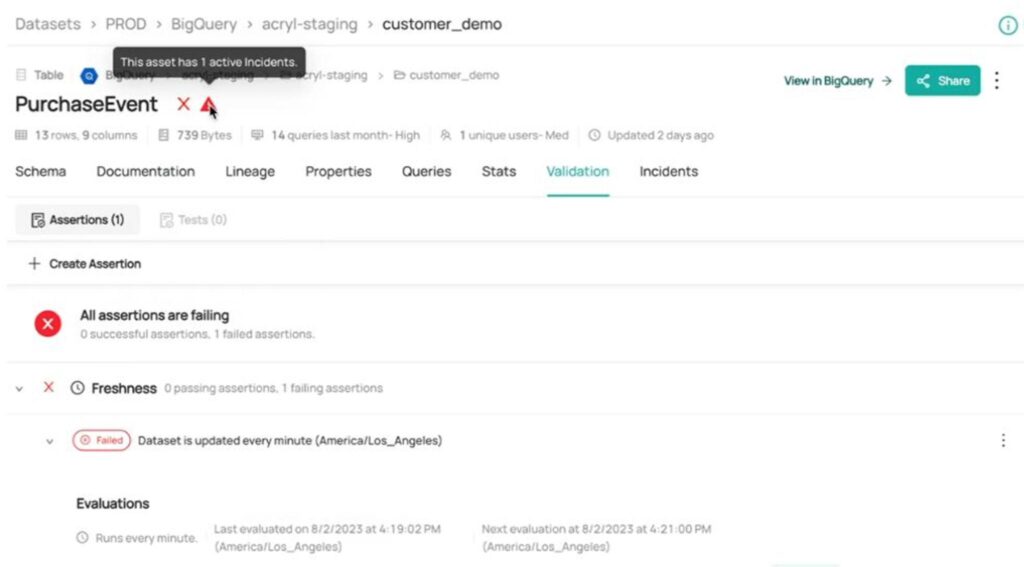 Acryl DataHub supports creating and scheduling ‘Freshness Assertions’ to monitor the freshness of the most important tables in your warehouse.